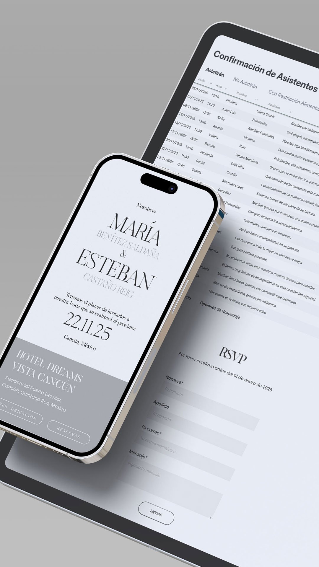 Tu Invitación Digital + video Save the Date + RSVP Online, listos para compartir a tus invitados en minutos.